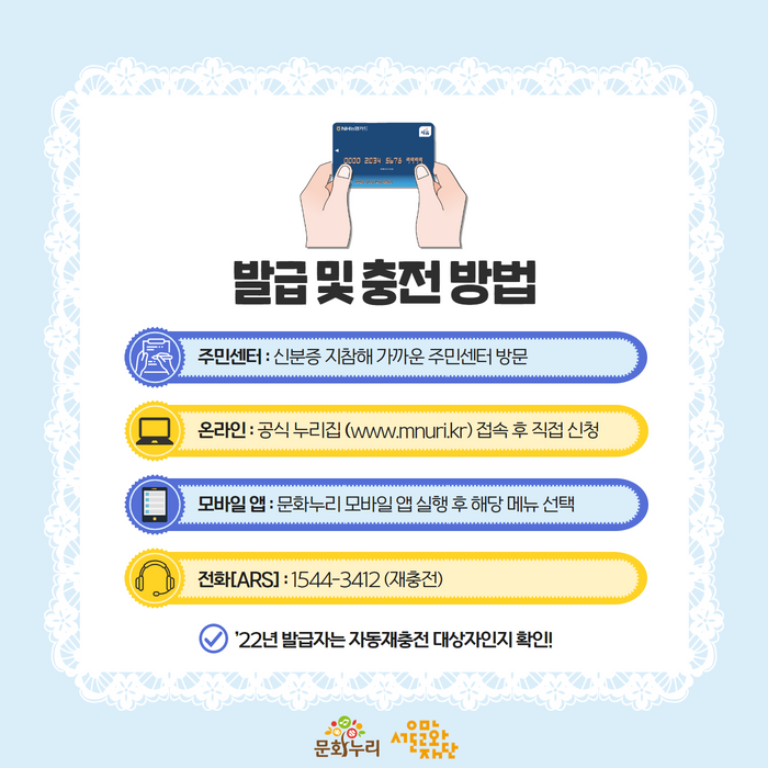 - 모바일 앱 신청: 문화누리카드 앱을 통해 간편하게 신청 가능